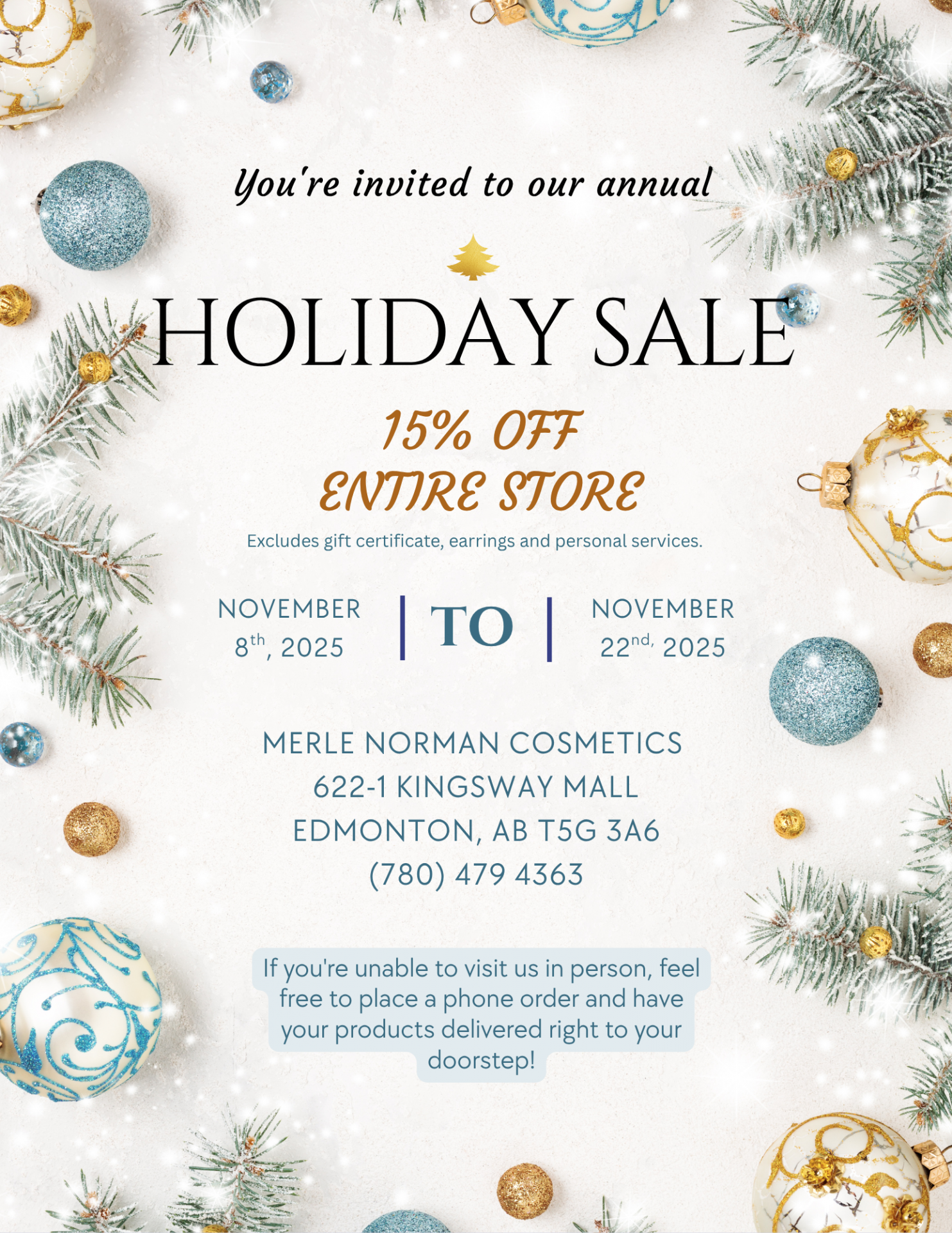 Sat, 8 Nov 2025 - Sat, 22 Nov 2025Shop 15% off the entire store during our Holiday Sale at Merle Norman Kingsway. Excludes gift certificates, earrings, and personal services.