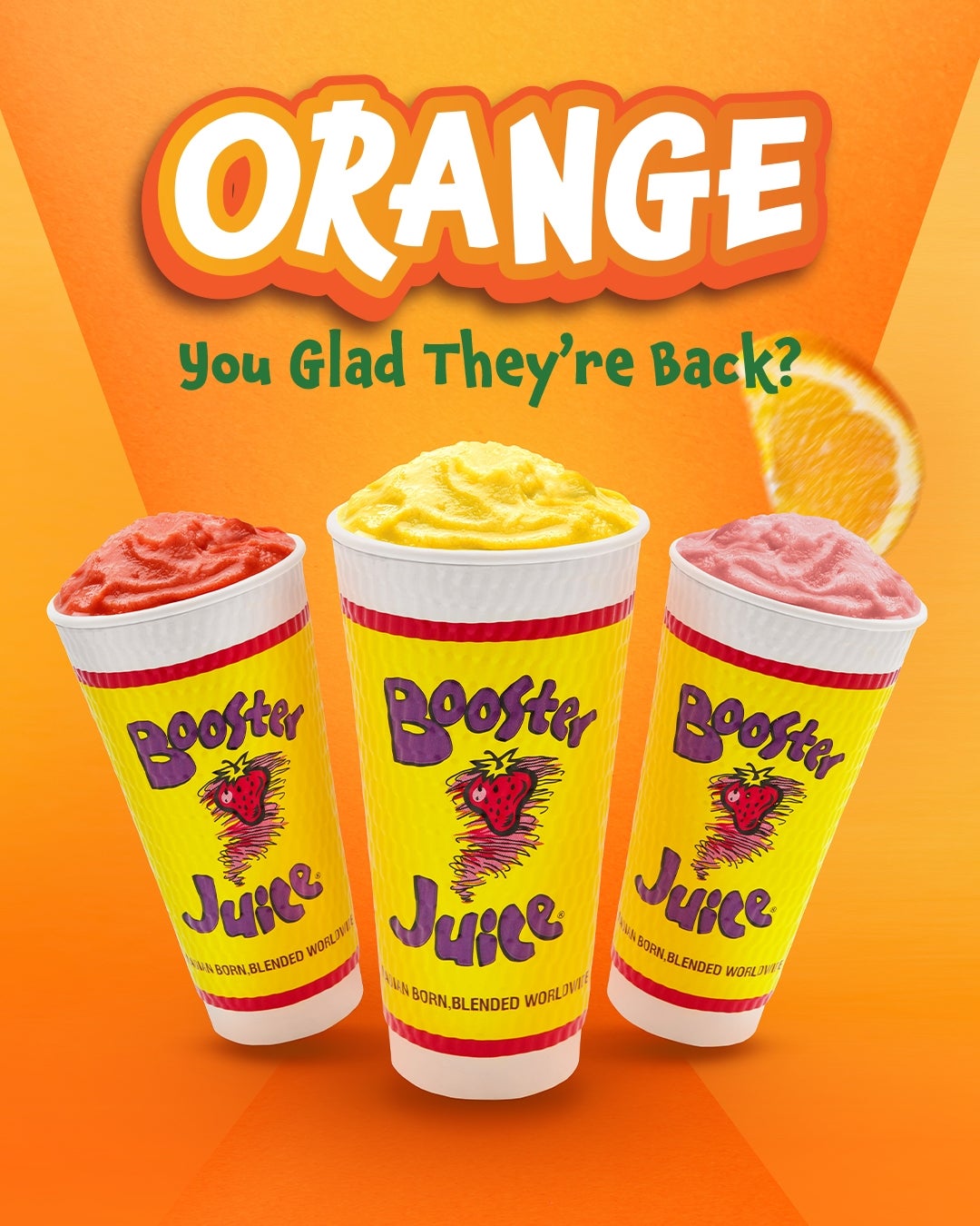 Thu, 13 Nov 2025 - Wed, 31 Dec 2025The wait is finally over smoothie fans, some of your favourites are back! Orange Smoothies have returned to Booster Juice for a limited time only! Come try all our a-peel-ing flavours like the Marathon Smoothie (250 Cals) made with cranberries, bananas, strawberries, orange sorbet, pea protein, and probiotic yogurt. The Original (203 Cals) made with oranges, bananas, strawberries, strawberry sorbet, and probiotic yogurt. And the Orangesicle (220 Cals) a delicious blend of oranges, orange sorbet, and vanilla frozen yogurt. Orange you craving one right now? Make sure to stop by your local Booster Juice to catch these smoothies before they peel out!
