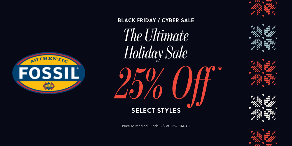 Wed, 19 Nov 2025 - Tue, 2 Dec 2025You've been waiting all year for these deals (and these gifts). Shop 25% off select styles at Fossil.