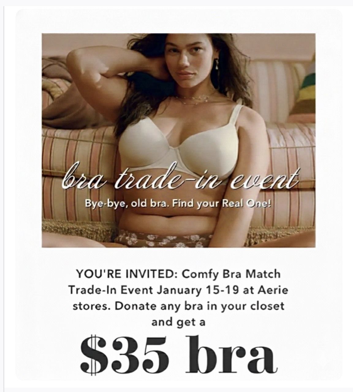 Thu, 15 Jan 2026 - Mon, 19 Jan 2026Customers can trade in their new or gently used bra/bralette/sports bra (any brand) to Aerie and get a new bra/bralette for $35! All gently used bras will be donated to I Support The Girls, a non profit that collect and distributes items to women experiencing impoverishment.
