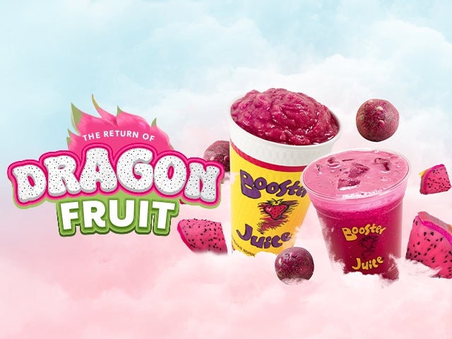 Mon, 12 Jan 2026 - Sun, 1 Mar 2026Behold the return of Dragon Fruit at Booster Juice! Prepare your tastebuds for a legendary journey. First stop on your quest, we have the Dragon Slay-ah Smoothie (370 Cals) forged from real dragon fruit, mangoes, pineapples, strawberries, and yogurt. Next stop, drive hunger back to the darkness with the Dragon Booster Ball (120 Cals) crafted with dragon fruit, white chocolate chips, dates, vanilla whey protein, chia seeds, coconut, and maple syrup. And lastly, if you need to refuel after a long day of slaying dragons, refresh with our Pink Dragon Booster Mix’r (130 Cals) made with dragon fruit, pineapples, coconut water, and lemon. Slay your thirst and hunger—only at Booster Juice!