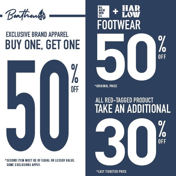 Shop exclusive brand apparel at buy one get one 50% off, Blackwell + Harlow footwear at 50% off, and red-tagged product at additional 30% off.