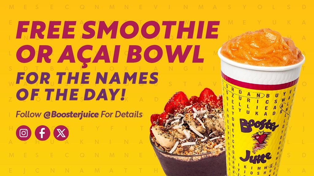 With Booster Juices Names of the Day promotion, you can unlock your main character energy. If your name gets announced on the Booster Rewards App or social media, stop by your local Booster Juice, check in with your Booster Rewards App, and enjoy a FREE Smoothie, or Açaí Bowl. Yes, really. It’s that simple. Free smoothie or açaí bowl offer is only valid if your name is announced for that day only, during operating hours. One free Regular Size Smoothie (710mL), or Açaí Bowl (473 mL) per qualified Booster Rewards member. Qualifying Booster Rewards members will be asked to show their name on their Booster Rewards App to confirm qualification. Additional photo identification will be required. Offer valid in-store at participating locations only, no extensions, management reserves all rights.