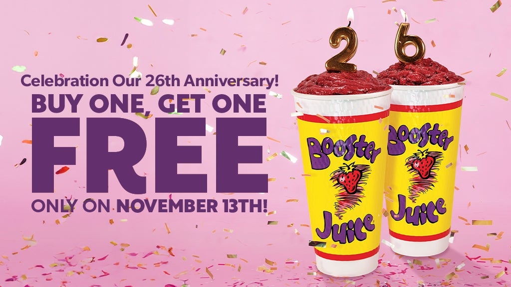 Sat, 1 Nov 2025 - Thu, 13 Nov 2025We’re turning 26—and you’re getting the gift! This November 13, Booster Juice is celebrating with a buy one, get one free on regular sized smoothies at all locations across Canada. Bring a friend, sip back, and celebrate with us — it’s the berry least we can do.